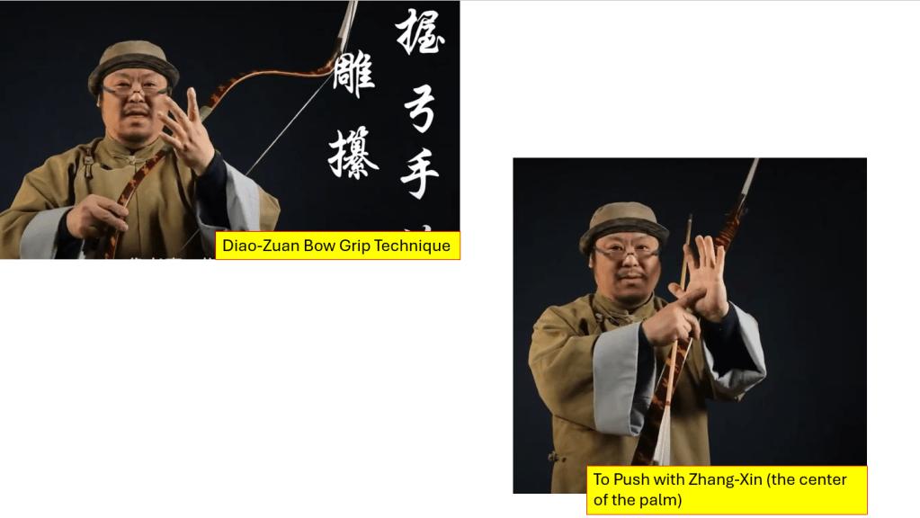 A good release and creating the temporary arrow window is built around a good bow hand grip. The essence of a good grip is pushing the bow handle with one’s Zhang-Xin, which is often known as the meaty part on one’s palm. Mr. Li, however, suggested that “Zhang-Xin” is not a findable body part and created by one’s proper gripping of the bow.