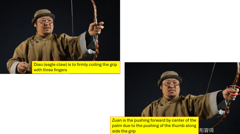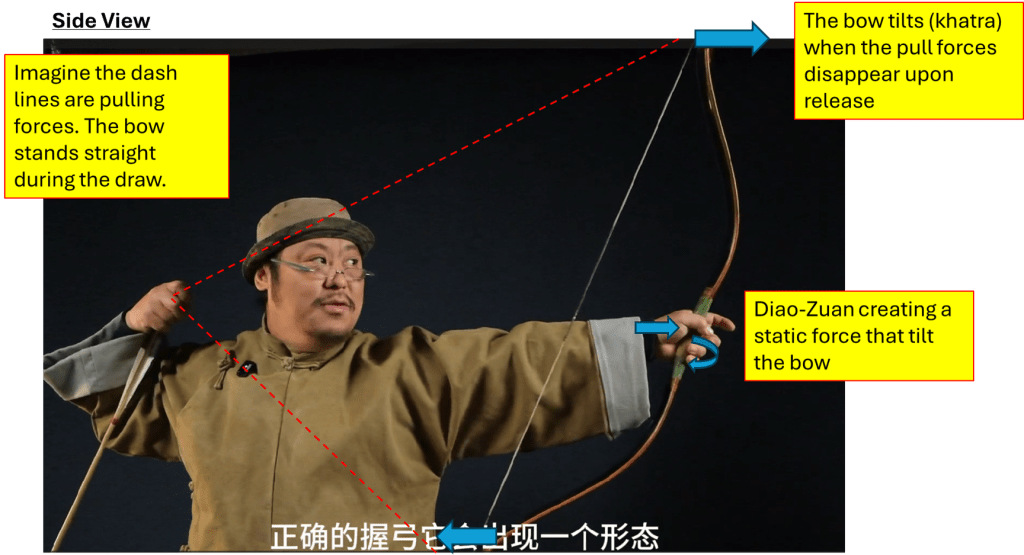 Traditional archers use “Khatra” to create a window to the arrows to clear the bow and the archer’s bow hand . This minimizes interferences to the arrow’s flight. A Qing style Khatra is unintentional. It is created by solely the static force coming from the Diao-Zuan grip. When the string is released, the bow will tilt forward and one’s bow hand subtly clear the arrow. Refer to the Step-by-Step guide for the Diao-Zuan Grip.
