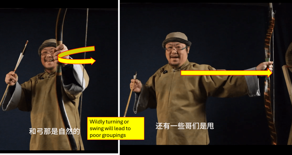 Most traditional and Manchu bow archers are aware of the incompatibility of the “Mala-Sonata” approach with their traditional style bows. They might perform khatra to create the temporary arrow window upon releasing the arrows in ways that might not be most suitable with Qing / Manch bow. Some new archers may even swing the bow wildly thinking that they are performing a khatra. The result is a wide horizontal spread in arrow grouping.