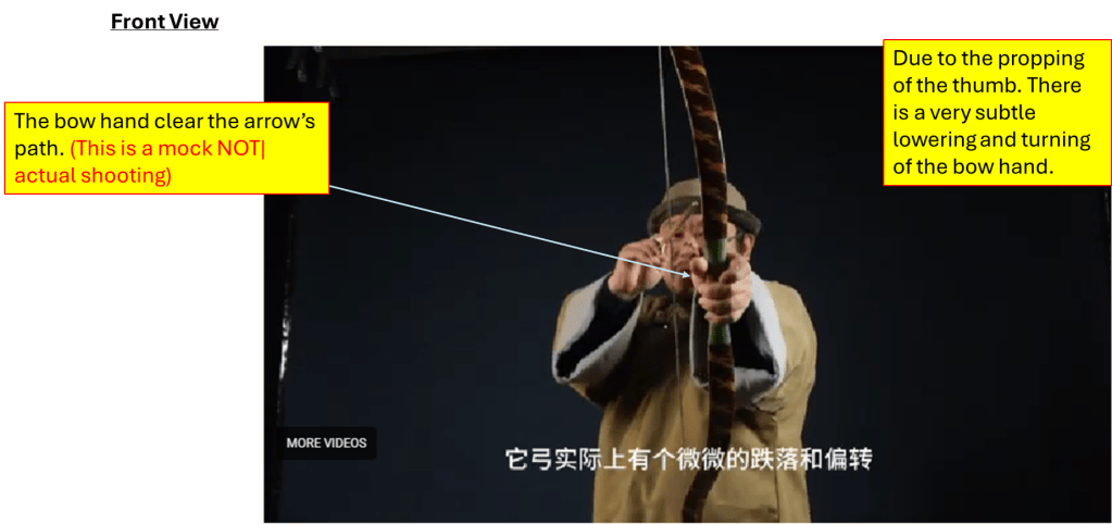 When this grip is applied when drawing the bow and then releasing the string, we can observe the creation of a temporary arrow window by two resulting phenomenon: Dian-Shao (点弰,the tilting of the top shiyah) and the front hand dropping away from the flying arrow.