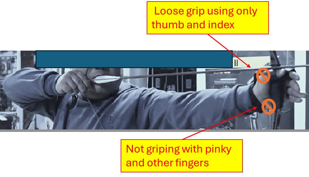- Gripping like a modern recurves with a loose grip using the index finger and thumb.